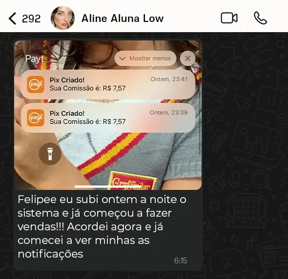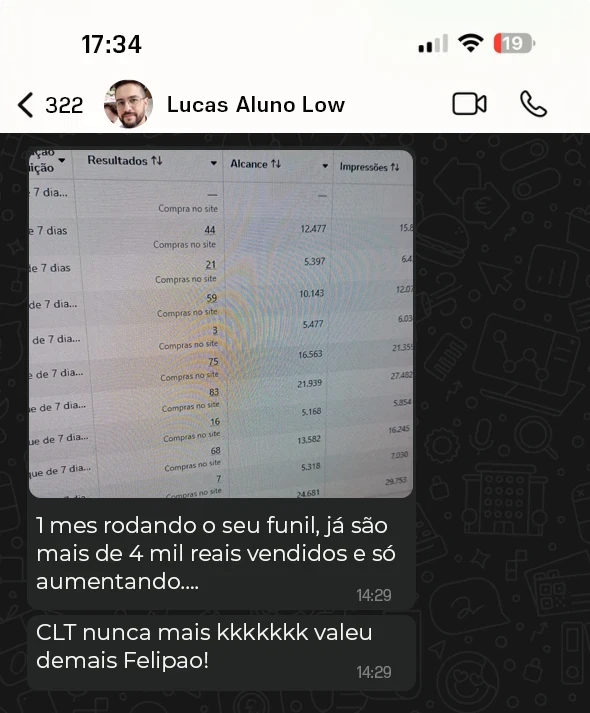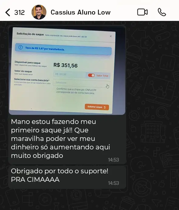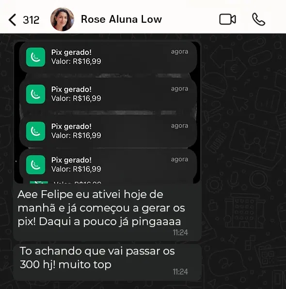 Vou ter resultados?A maioria dos alunos já começam a receber os PIX das Vendas e Lucram logo nos primeiros dias, isso porque diferente deles terem que aprender para aplicar e construir algo do zero, no Sistema Low Ticket Automático tudo já está pronto. Inclusive com Produtos Validados que se Somados Vendem Mais de 1 MILHÃO de Reais por Mês.