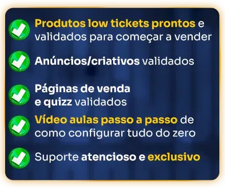 O Sistema Low Ticket é um curso?Não. É uma plataforma onde você vai receber tudo pronto: Os produtos low tickets, anúncios, paginas... Mas fique tranquilo que também disponibilizamos tutoriais e vídeo aulas curtas com passo a passo, de como usar e configurar tudo, para que você possa ter o máximo de resultado no menor tempo possível.